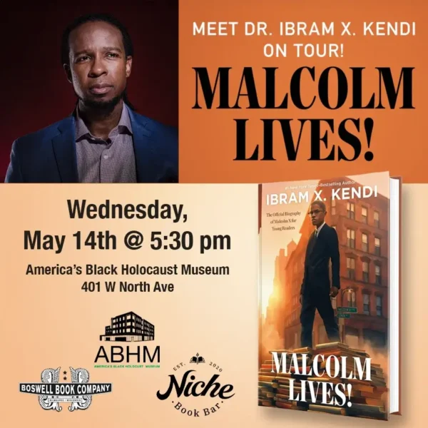 America’s Black Holocaust Museum, Niche Book Bar, and Boswell Books host an event with National Book Award winner Dr. Ibram X Kendi, author of books like Stamped from the Beginning and How to Be Antiracist, for his latest work, Malcolm Lives!, a ground-breaking young readers’ narrative biography.